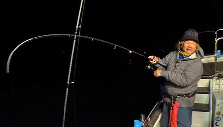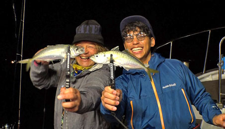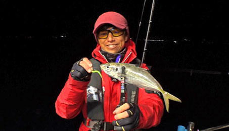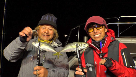 夕方に港を出船し、ポイントとなる場所までわずか15分ほどで到着。バチコンで使用するワームは形状やサイズ、カラーも様々。いろいろ使い分けてアタリパターンを探っていきます。集魚灯の効果が効いてくるとヒットが連発!美味しいお土産をたくさんゲットしていきます。