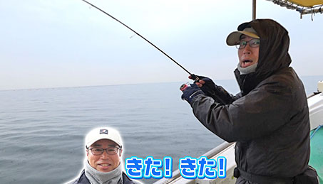 まずは伊丹がヒット!水面までは上がり、姿を見せたものの『痛恨のバラシ』。その後はアタリも無く時間だけが過ぎて行くが、予想通り午後4時にダブルヒット。果たして二人はサワラをゲット出来るのか!?