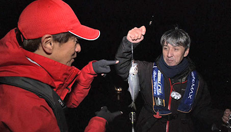 釣り方はイカメタルゲーム。専用のタックルで様々なアクションをして、ティップに出る繊細なアタリを捉え、イカを掛けて釣る。明るい内にポイントに到着し、ケンサキイカをゲット。暗くなり始めた頃、船の集魚灯を点け、ここからが本格的にスタート。