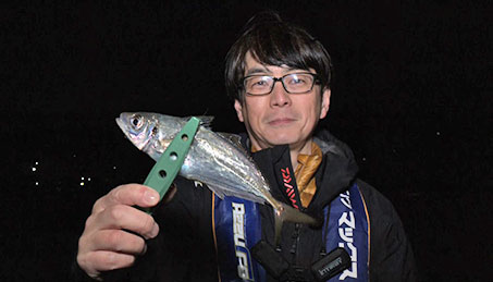夜明け前の暗い時間に、30cmクラスの良型アジが釣れる!と言う事で、撮影開始は午前4時。ウキ付きのサビキ仕掛けを軽くキャストして、ウキからカゴまでは、6mから7mで、ほぼ底付近。大きなウキが消し込み、姿を見せたのは20cm後半の良型アジ。その後も次々と竿が曲がり、30cmクラスのアジが入れ喰い状態となる。