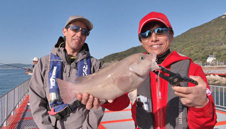 朝一番は、一般的にはマダイが釣れるのが普通だが、なんと1投目から高級魚のクエを連発でゲットし、波乱のスタート。その後は狙い通りにマダイを次々とゲットし、まずはお土産を確保。マダイやシマアジなどの放流のタイミングで、魚の活性が上がり、マダイはもちろんシマアジなども姿を見せる。