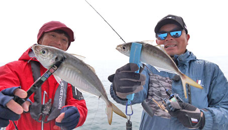 ハマチやメジロは十分という事で、メタルジグにサビキを付けたSLJサビキで、良型アジとハマチを狙う二刀流。30cm前後のアジを釣る中、広瀬マンの竿が大きく曲がった。これは巨大アジかメジロか!?