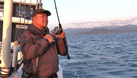 続いては青物ジギング。メインターゲットはハマチ・メジロ・ブリ。しかしこの日は激渋で殆どアタリも無し。手を変え品を変え狙っている時に向林さんの竿が曲がった!
